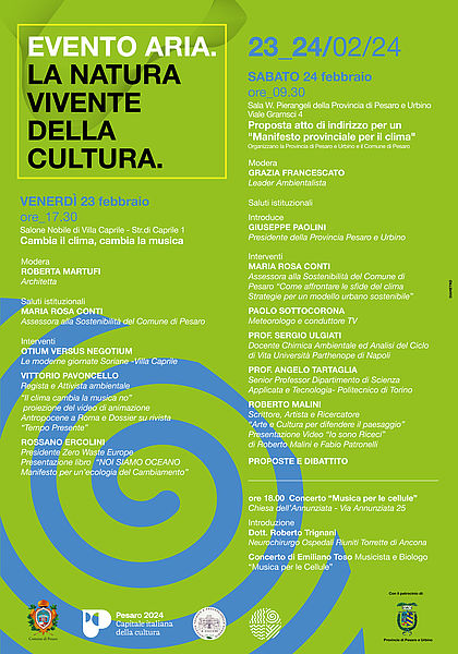 S’intitola “La natura vivente della cultura” il ciclo di 20 tra incontri e appuntamenti in programma da venerdì 23 febbraio fino a maggio promosso dall’assessorato alla Sostenibilità del Comune per esplorare le connessioni tra i quattro elementi della vita (aria, acqua, terra e fuoco) e congiungerle a La natura della cultura di Pesaro 2024.