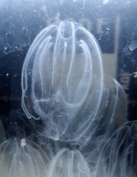 Si tratta di Mnemiopsis leidyi appartenente al phylum degli Ctenofori, chiamate anche “Noci di mare”, organismi di qualche centimetro di lunghezza che possono sembrare bolle gelatinose, innocue all’uomo perché sprovvisti di cellule urticanti.