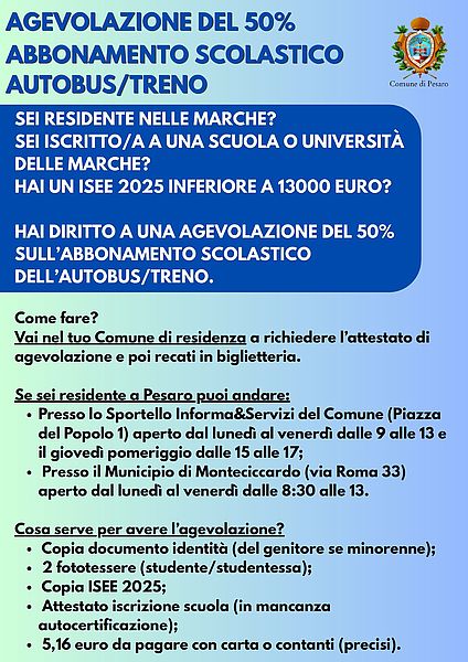 Gli studenti e le studentesse residenti nella Regione Marche iscritti/e a una scuola o università delle Marche con un ISEE 2025 inferiore a 13000 euro hanno diritto a una agevolazione del 50% sulla tariffa dell'abbonamento autobus/treno.