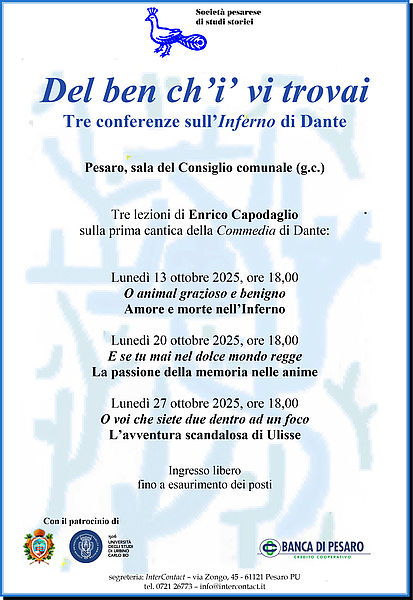 La Società pesarese di studi storici propone un ciclo di tre conferenze sull'«Inferno» dantesco, che avranno luogo nei lunedì 13, 20 e 27 ottobre 2025 alle ore 18,00 presso la sala (g.c.) del Consiglio comunale di Pesaro, come da allegato programma.