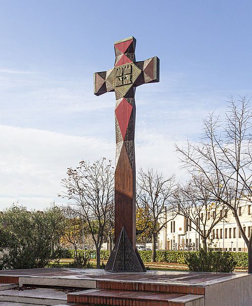 La committenza di quest’opera di Loreno Sguanci è legata alla comunità parrocchiale di Santa Croce guidata allora da Don Alberto Levrini e ha avuto tra i principali finanziatori il comitato ‘Città per Alessia’. La croce è stata benedetta il 26 novembre 2000, nell’anno del Giubileo e in occasione del 25esimo della fondazione della parrocchia. Fin da subito, la presenza della scultura è divenuta occasione per realizzare importanti cicli di conferenze con relatori di chiara fama. Nelle intenzioni del suo autore, si innalza nel cielo ed abbraccia il mondo: il simbolo della sofferenza si trasforma in quello della salvezza. E continua: …credo che questo pensiero abbia sorretto il mio lavoro di scultore nella realizzazione della grande Croce aiutandomi ad immaginare un movimento plastico che, attraverso l’incrocio della struttura verticale con quella orizzontale, rivelasse una partecipazione forte dei sentimenti; come se la presenza dell’Uomo si fosse impressa nelle fibre stesse del legno svelando poi, nelle superfici rosse, il segno del Sacrificio, del Riscatto e della Speranza. Le due grandi formelle bronzee al centro hanno impresse l’immagine dei quattro Evangelisti e sull’altro lato l’iscrizione Christus heri, odie, semper. L’opera è simbolo della cristianità ma segna anche l’inizio di un percorso, frutto di una precisa progettazione dello spazio: la base rialzata della croce, la pavimentazione decorata del sagrato, insieme all’acquasantiera e al fonte battesimale, accompagnano idealmente credente e visitatore fino all’altare.