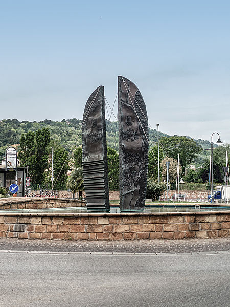 Il complesso scultoreo di Giovanni Gentiletti ricorda l’impresa dell’equipaggio di Azzurra, la barca a vela da regata costruita a Pesaro per gareggiare alla Coppa America del 1983. L’Italia partecipava per la prima volta alla prestigiosa sfida e grande fu l’orgoglio cittadino quando la realizzazione dell’imbarcazione viene affidata al cantiere locale Yachts Officine. Nel 2002, per ricordare questa avventura, le associazioni pesaresi Assonautica, A.N.M.I., Club Nautico, Circolo Velico Ardizio, Compagnia della Vela, Fratelli della Costa, Lega Navale, Panathlon Club e Società Canottieri coordinate da Paolo Morsiani, propongono all’amministrazione comunale una scultura in rame dell’artista Gentiletti, esperto conoscitore dei metalli. L’opera è una rielaborazione simbolica di due alte vele che si incrociano e si affrontano in un duello di bolina. Non casuale la sede scelta per la sua collocazione nel 2006: la grande rotatoria con fontana al termine di via Cecchi molto vicina al porto dove Azzurra era nata. Il titolo è suggerito allo scultore dai versi dell’amico Franco Ampollini che lo ispirano a tal punto da imprimerli sulla lastra di rame attraverso i suoi tipici segni alfabetici, ad evocare l’idea di un’iscrizione archeologica. ‘Nel vento del mito’ onora la vocazione marinara della città di Pesaro e un evento sportivo unico che ha portato lustro al territorio, ma celebra anche l’operosità di chi con il mare ci vive e sul mare scommette: la comunità dei pescatori, degli sportivi e dei cantieri. 1499