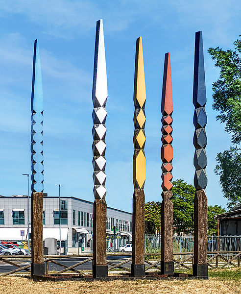 I Poli/s/Pali sono costituiti da cinque elementi plastici in legno variamente componibili che evocano totem o antichi obelischi con la loro autorevole regalità. Il giallo, il rosso, l’azzurro, il bianco e il nero che caratterizzano le singole strutture ne rafforzano l’idea di segnali e indicatori di momenti significativi per la collettività. Sono stati pensati per essere trasportati e installati secondo vari schemi compositivi all’interno di un tessuto urbano già connotato da elementi storici e naturali invariabili e nascono con la funzione di segnalare con la loro presenza eventi e manifestazioni pubbliche concepiti come appuntamenti importanti di vita partecipata. Sono, dunque, un richiamo al confronto e alla riscoperta di un’appartenenza ad una storia comunitaria più vasta. Il gruppo plastico è stato utilizzato per la prima volta nel 1980 in occasione dell’inaugurazione del Teatro Rossini riaperto alla città dopo un restauro di 14 anni con la prima edizione del Rossini Opera Festival. Innalzati nella corte di Palazzo Mazzolari, i ‘Poli s Pali indicavano la sede di concerti e balletti moderni previsti nel programma del ROF, assolvendo così a quella funzione di fantastico segnale araldico, più volte usata nel territorio pesarese. Nel 1981 il Comune di Firenze li chiede in prestito per esporli nel Giardino delle Oblate. Dopo essere stati eretti per un lungo periodo davanti al complesso edilizio di via Nanterre che accoglieva e accoglie tuttora uffici dell’Azienda Sanitaria Regionale, la Circoscrizione e la Biblioteca di Quartiere, i ‘Poli s Pali’ sono stati collocati nel parco pubblico della via. Ora sono in attesa di nuova collocazione dopo il restauro.