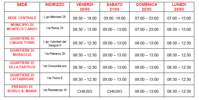 In occasione del referendum popolare confermativo del 22 e 23 marzo 2026, è stata disposta ll'apertura straordinaria dell'ufficio elettorale presso la sede centrale, dello sportello del Municipio di Monteciccardo nonché degli Uffici anagrafici decentrati al fine di favorire sul territorio il rilascio delle tessere elettorali e dei relativi duplicati, come da calendario di seguito riportato.