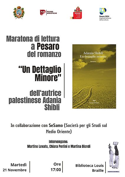 L’appuntamento rappresenta la tappa locale della maratona dedicata all’ultimo lavoro della Shibli, promossa in tutta Italia da Sesamo - Società per gli Studi sul Medio Oriente, in risposta alla decisione dell’ultima Fiera del Libro di Francoforte di cancellare la consegna del premio letterario LiBeraturpreis all’autrice palestinese; un’iniziativa per sottolineare il ruolo che la letteratura riveste nel creare occasioni di confronto. Dopo Roma, Torino, Milano, Bologna e altre destinazioni, il Comune di Pesaro ha accolto quindi la proposta di organizzare un evento nella Biblioteca di Baia Flaminia, in cui verranno letti e discussi alcuni passaggi del romanzo di Adania Shibli.