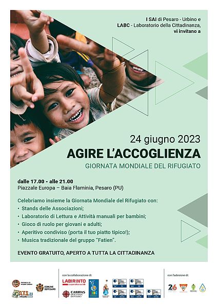 Pesaro onora e festeggia la Giornata mondiale del Rifugiato, indetta dalle Nazioni Unite per commemorare la Convenzione relativa allo status dei rifugiati. Per l’occasione, i progetti SAI (Sistema Accoglienza Integrazione) di Pesaro e Urbino e il LABC - Laboratorio della Cittadinanza dell’Ats1, insieme a Festa dei Popoli ODV, Caritas Pesaro e Labirinto Coop. Sociale organizzano, sabato 24 giugno, dalle 17 alle 21, in piazzale Europa (Baia Flaminia) “Agire l’accoglienza”. Una manifestazione (ingresso gratuito) promossa per «tenere alta l’attenzione sul tema delle migrazioni e sensibilizzare la cittadinanza sui temi dell’accoglienza e del rispetto dei diritti di ogni individuo soprattutto considerati i numeri record di quest'anno: 110milioni di rifugiati nel mondo di cui il 41% bambini; 355.000 in Italia di cui quasi la metà ucraini» ha sottolineato Luca Pandolfi, assessore alla Solidarietà e presidente del comitato dei sindaci dell’Ats1.