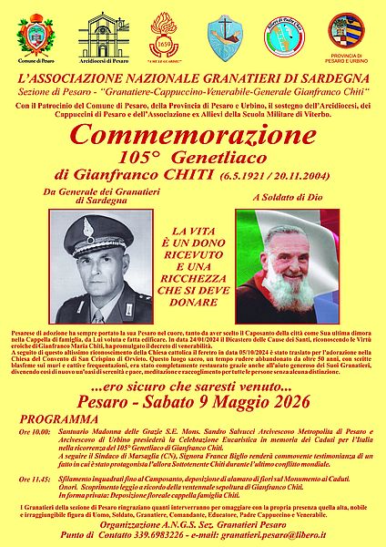 Sabato 9 maggio dalle ore 10, nel Santuario Madonna delle Grazie, L Associazione Nazionale Granatieri di Sardegna Sezione " Granatiere-Cappuccino-Venerabile-Generale Gianfranco Chiti " con il patrocinio del Comune di Pesaro, della Provincia di Pesaro e Urbino, il sostegno di: Arcidiocesi, Cappuccini e Associazione Allievi Scuola Militare di Viterbo, organizza la commemorazione per il 105° genetliaco di Gianfranco Chiti. ( 6-5-1921/20-11-2004)