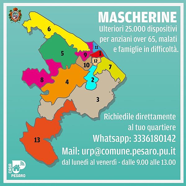 PESARO – «Una scorta di ulteriori 25mila mascherine gratuite del Comune per anziani, malati e persone in difficoltà economica sarà messa a disposizione dei quartieri». Lo comunica il sindaco Matteo Ricci. I dispositivi potranno essere ritirati nel proprio quartiere di appartenenza (per informazioni: whatsapp 333.6180142; mail: urp@comune.pesaro.pu.it). In queste ore, inoltre, si sta completando la distribuzione delle mascherine ‘porta a porta’ in tutta la città, «ultimando la consegna nel quartiere Centro», aggiorna il sindaco. «Si tratta di uno sforzo straordinario del Comune: un grande ringraziamento per la collaborazione a Croce Rossa, Banca di Pesaro e a tutti i volontari di quartiere che hanno rafforzato ulteriormente il senso di comunità in città», sottolinea Ricci. In totale saranno distribuite 230mila mascherine ai pesaresi.