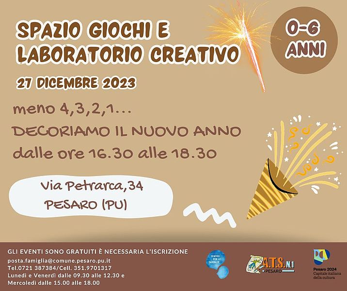 Mercoledì 27 dicembre dalle 16.30 alle 18.30, vi aspettiamo con Spazio Giochi 0-6 anni, che in questa occasione sarà arricchito da uno speciale laboratorio "Meno 4,3,2,1...decoriamo il nuovo anno".