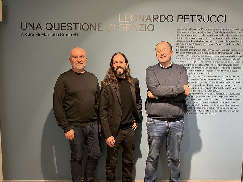 Ha aperto Marcello Smarrrelli: la sala del piano terra di Palazzo Mosca appena denominata ‘Project Room’ - che verrà d’ora in poi dedicata alla grafica vista la tradizione forte del territorio in questo ambito - accoglie la mostra di Fato che ha già avuto un importante personale in Pescheria. Questa volta è un lavoro inedito, la sua prima mostra di grafica ed è interessante perché Fato insegna proprio grafica da tanti anni all’Accademia di Urbino. Per lui la grafica è un modo per studiare gli artisti che ama, fra l’altro stiamo parlando di artisti marchigiani. Nell’ammezzato, invece, la mostra che chiude il 23 e apre il 24 che dunque troveranno i primi visitatori di Pesaro Capitale: per questo volevamo che fosse una mostra paradigmatica dei temi che hanno guidato Pesaro 2024: arte, natura e tecnologia. E abbiamo trovato un artista che rappresenta perfettamente questa triade. Petrucci presenta un lavoro degli ultimi 10 anni di ricerca attorno a temi come l’astrologia, la geometria sacra, tutte materie parascientifiche. L’idea guida per cui questa mostra è un vero e proprio manifesto di Pesaro 2024 è che dalla tecnologia ispirandosi alla natura possono nascere opere d’arte.