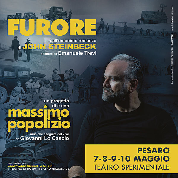 Nell’estate del 1936, il San Francisco News chiese a John Steinbeck di indagare sulle condizioni di vita dei braccianti sospinti in California dalle regioni centrali degli Stati Uniti, soprattutto dall’Oklahoma e dall’Arkansas, a causa delle terribili tempeste di sabbia e dalla conseguente siccità che avevano reso sterili quelle terre coltivate a cotone. Il risultato di quell’indagine fu una serie di articoli da cui l’autore americano generò, tre anni dopo, nel 1939, il romanzo Furore. Quello a cui assisterete è il racconto di come John Steinbeck trasformò quella decisiva esperienza giornalistica, umana e politica in grande letteratura. È una straordinaria figura di narratore – nello stesso tempo arcaica e modernissima – che può prendere forma in un lavoro di drammaturgia basato sul capolavoro di John Steinbeck. E forse non c’è un attore, nel panorama teatrale italiano, più in grado di Massimo Popolizio di prestare a questo potentissimo, indimenticabile «story-teller» un corpo e una voce adeguati alla grandezza letteraria del modello. Leggendo Furore, impariamo ben presto a conoscerlo, questo personaggio senza nome che muove i fili della storia. Nulla gli è estraneo: conosce il cuore umano e la disperazione dei derelitti come fosse uno di loro, ma a differenza di loro conosce anche le cause del loro destino, le dinamiche ineluttabili dell’ingiustizia sociale, le relazioni che legano le storie dei singoli al paesaggio naturale, agli sconvolgimenti tecnologici, alle incertezze del clima. Tutto, nel suo lungo racconto, sembra prendere vita con i contorni più esatti e la forza d’urto di una verità pronunciata con esattezza e compassione. Più che a una «riduzione», riteniamo che un progetto drammaturgico su Furore debba tendere a esaltare le infinite risorse poetiche del metodo narrativo di Steinbeck, rendendole ancora più evidenti ed efficaci che durante la lettura. Raccontando la più devastante migrazione di contadini della storia moderna, Massimo Popolizio darà vita a un one man show epico e lirico, realista e visionario, sempre sorprendente per la sua dolorosa, urgente attualità. Il controcanto è affidato al caleidoscopio di suoni realizzati dal vivo dal percussionista Giovanni Lo Cascio. Emanuele Trevi