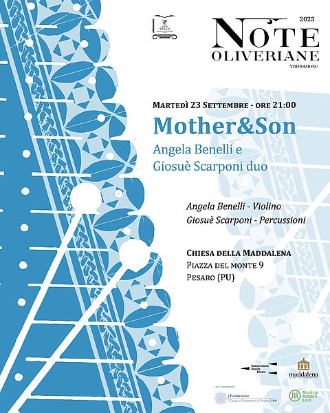 Il duo d’eccezione Mother & Son - composto da Angela Benelli al violino e Giosuè Scarponi alle percussioni - si esibisce in un repertorio di autori contemporanei che hanno indirizzato la loro ricerca artistica verso un’espressione musicale che pone il ritmo, piuttosto che la melodia, al centro della dimensione compositiva. Astor Piazzolla con la rievocazione del tango argentino classico e l’esaltazione della forza vitale dell’amore come forza primordiale e unificante dell’essere umano, Chick Corea e il jazz come celebrazione del vitalismo e della forza creatrice della musica, Emanuel Sejourne e John Psathas sono solo alcuni dei protagonisti di questo itinerario attraverso le suggestioni della musica contemporanea.