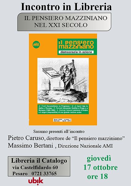 Giovedì 17 ottobre ore 18.00 si presenta la rivista "Il pensiero mazziniano" con Pietro Caruso e Massimo Bertani.