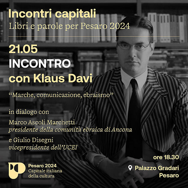“Marche, comunicazione ebraismo” è il titolo dell’incontro con il giornalista Klaus Davi in programma martedì 21 maggio a Pesaro nell’ambito della rassegna ‘Incontri capitali’ (Palazzo Gradari, ore 18.30). Davi dialogherà con Marco Ascoli Marchetti presidente della comunità ebraica di Ancona e con Giulio Disegni vicepresidente dell’Ucei, Unione delle Comunità Ebraiche Italiane.
