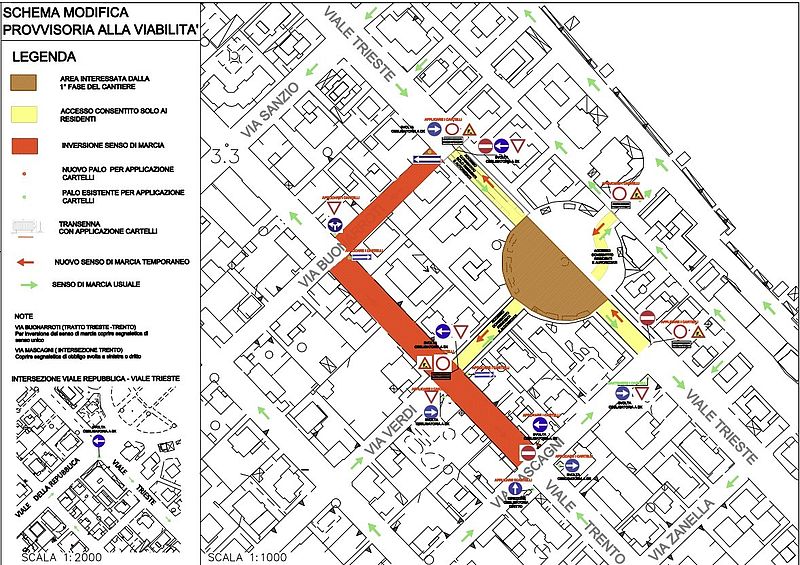 La direzione di marcia sarà invertita sia in via Buonarroti, per raggiungere viale Trento, sia nel tratto di viale Trento compreso tra via Buonarroti e via Mascagni, da cui sarà possibile raggiungere di nuovo viale Trieste.