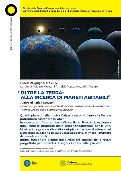 L’astrofisica Ilaria Pascucci, professore di Scienze Planetarie presso l’Università dell’Arizona, Premio Circolo della Stampa/Pesaro 2024, esplorerà quali sono le proprietà della Terra fondamentali per la vita.
