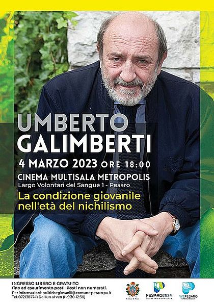 Il 4 marzo Pesaro chiude il suo anno da Città italiana dei Giovani 2022 con una lectio magistralis del filosofo Umberto Galimberti. Un appassionato intervento dal titolo “La condizione giovanile nell'età del nichilismo", sul tema del disagio e del nichilismo giovanile, sull'adolescenza, sulle possibilità di uscire dalle difficoltà e sul ruolo dei genitori. Appuntamento sabato, alle 18, al cinema Multisala Metropolis in via Volontari del Sangue 1, «Chiudiamo così, con uno degli intellettuali più impegnati dei nostri giorni, un anno importante e molto formativo», spiega l’assessora con delega alle Politiche Giovani Camilla Murgia. I posti sono limitati, per informazioni è possibile inviare una mail a politichegiovanili@comune.pesaro.pu.it o contattare gli uffici al numero di telefono 0721.387741 (da lunedì al venerdì dalle 9:30 alle 12:30).