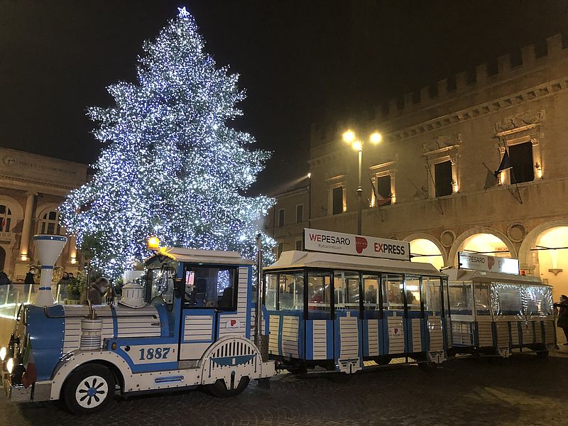 Ad arricchire il percorso dello shopping e a garantire una fruizione regolamentata e divertente della città sarà “WePesaro express” il trenino turistico, composto da 4 carrozze e agghindato a festa, che accompagnerà i pesaresi nel centro e nelle vie più caratteristiche di Pesaro in un percorso della durata complessiva di 15 minuti. La capienza del trenino sarà limitata. All’ingresso verrà misurata la temperatura a tutti i fruitori, che dovranno salire con la mascherina. Le carrozze sono divise da pannelli in plexiglass, i vagoni saranno arieggiati e igienizzati tra un turno e l’altro e verrà garantito il rispetto delle normative anti assembramento. “WePesaro express” è un treno ecologico (metano), sarà attivo da oggi (sabato 28 novembre 2020) fino a mercoledì 6 gennaio 2021, dal lunedì a giovedì dalle 10:30 alle 12:30 e dalle 15 alle 19:30; venerdì, sabato, domenica e festivi dalle 10 alle 12:30 e dalle 14:30 alle 20. Il costo è di 3 euro.