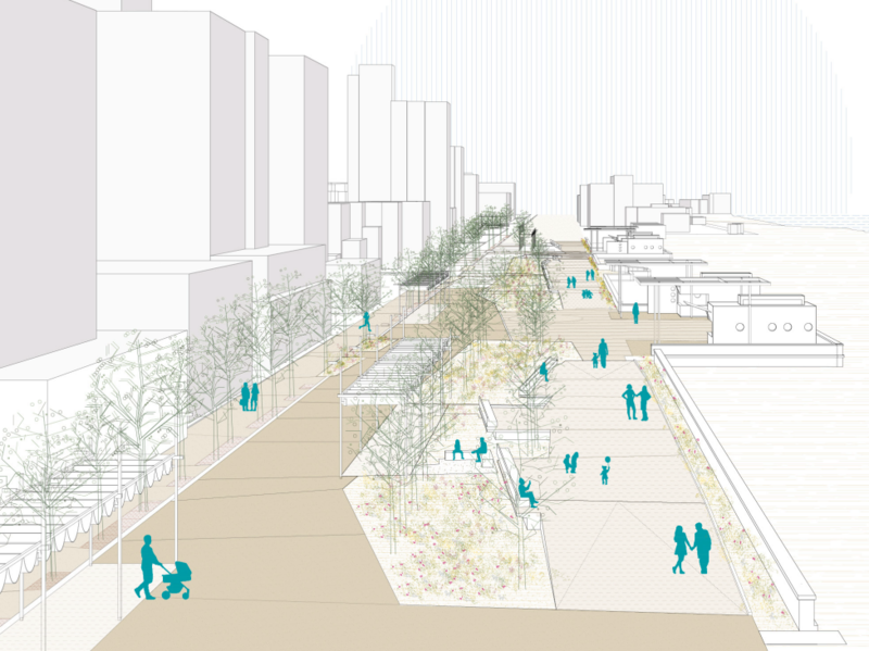 Il lungomare viene ripensato come uno spazio continuo e accogliente, attrezzato e arredato, e come un grande viale urbano ciclopedonale alberato ma organizzato in modo molto flessibile per rispondere alle molteplici esigenze di utilizzo e accessibilità che intorno a esso ruotano, anche dei vari operatori.