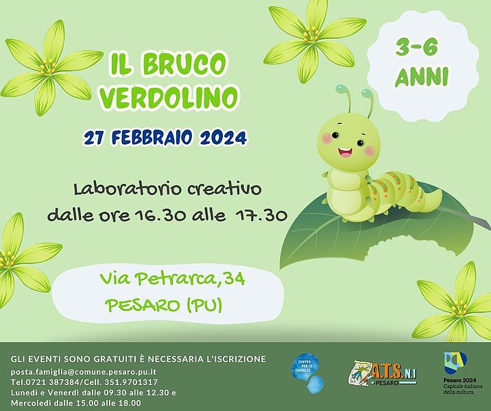 Martedì 27 febbraio dalle ore 16.30 vi aspettiamo a Pesaro, in via Petrarca, 34, con "Il Bruco Verdolino", un laboratorio creativo dedicato ai bimbi 3-6 anni!