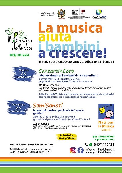 Dopo una breve pausa estiva, sabato 24 e domenica 25 settembre - presso Casa “La Gaida” (strada Carloni, 12) - tornano gli appuntamenti di “La musica aiuta i bambini a crescere!”, il calendario di iniziative per diffondere a Pesaro il programma nazionale “Nati per la Musica” e promuovere il canto corale tra i bambini, promosso dall’associazione “Il Giardino delle Voci” in collaborazione con il Comune di Pesaro/Assessorati alla Bellezza, Crescita e Solidarietà.