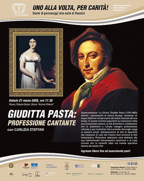 Sabato 21 marzo alle ore 17.30, il Salone «Antonia Pallerini» di Palazzo Gradari, accoglie una nuova tappa della rassegna della Fondazione Rossini 'Uno alla volta, per carità'. La musicologa Carlida Steffan presenterà l’affascinante figura della “prima donna” Giuditta Pasta. Soprannominata “La Divina”, Giuditta Pasta (1797-1865) dominò i palcoscenici di mezza Europa, lasciando un segno distintivo nel panorama del teatro musicale del suo tempo. In questo incontro seguiremo la costruzione della sua eccezionale carriera, la rete di familiari e collaboratori che la sostennero e l’ampio impegno professionale richiesto a una “cantatrice” del suo livello: dai lunghi viaggi ai concerti privati, dall’esecuzione di titoli di repertorio alla creazione di ruoli che l’hanno resa un’icona di stile interpretativo. Particolare attenzione sarà dedicata alle sue indimenticabili interpretazioni rossiniane e al ruolo centrale che la cantante ebbe nel mondo operistico italiano del secolo XIX. L’appuntamento sarà replicato il 9 maggio prossimo a Saronno (VA), città natale dell’artista e sede della raccolta museale La divina | Giuditta Pasta.